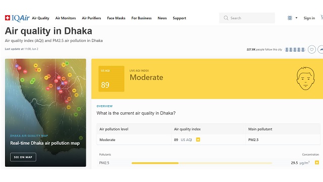 রোববার (২ জুন) দুপুর ১২টায় সুইজারল্যান্ডভিত্তিক বায়ুমান বিষয় ওয়েবসাইট আইকিউএয়ার এ দেখা গেছে, ঢাকার বাতাস ৮৯ স্কোর নিয়ে মানসূচকে আছে। বায়ু মানের এই স্কোরকে বলা হয়েছে মডারেট বা সহনীয়।