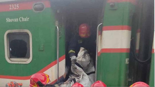 আগুনে ট্রেনটির তিনটি বগি পুড়ে যায়। এর মধ্যে একটি বগি থেকে চারজনের মরদেহ উদ্ধার করা হয়েছে।