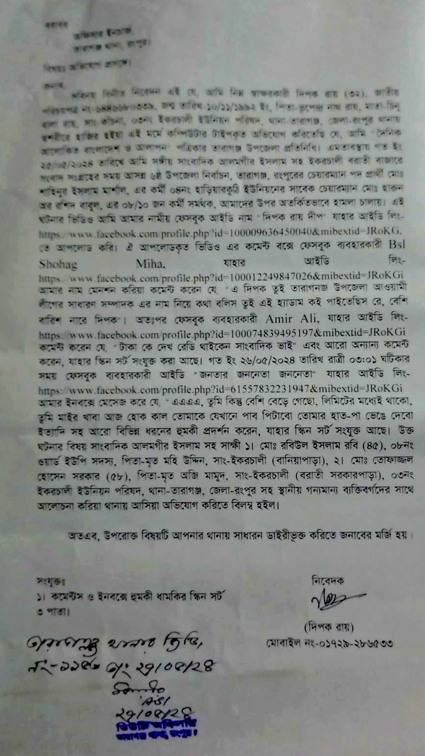 এদিকে অভিযোগ দায়ের করায় ক্ষিপ্ত হয়ে উপজেলা আওয়ামী লীগের সাধারণ সম্পাদক হারুনর রশীদ বাবুল তার লোকজন দিয়ে সাংবাদিক দীপক রায় ও আলমগীর ইসলামকে প্রাণনাশের হুমকি প্রদান করছে। শুধু তাই নয় ফেইসবুকে বিভিন্ন ফ্যাক আইডি থেকে হত্যা করার হুমকি প্রদান অব্যাহত রেখেছে। এতে করে জীবনের নিরাপত্তা চেয়ে সাংবাদিক দীপক রায় তারাগঞ্জ থানায় জিডি করে যার নম্বর ১১৫৩ তারিখ ২৭.০৫.২৪ইং।
