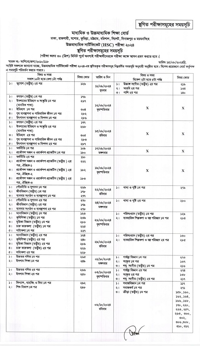 বৃহস্পতিবার (১৫ আগস্ট) ঢাকা মাধ্যমিক ও উচ্চ মাধ্যমিক শিক্ষা বোর্ডের ওয়েবসাইটে এ সময়সূচি প্রকাশ করা হয়।
