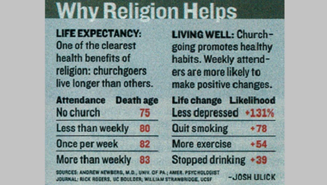 লিন্ডা এইচ পাওয়েল নামে শিকাগোর এক গবেষক এ সংক্রান্ত সব গবেষণাগুলোর একটা মেটা এনালাইসিস করেন। অপ্রাসঙ্গিক বা দুর্বল গবেষণাগুলোকে তিনি খুব কঠোরভাবে বাদ দেন তার তালিকা থেকে। তবে তিনি একটি বিষয়ে খুব চমৎকৃত হন যে, যে মানুষগুলো নিয়মিত চার্চে যায়, অন্যদের তুলনায় তাদের দ্রুত মারা যাওয়ার হার ২৫% কম।