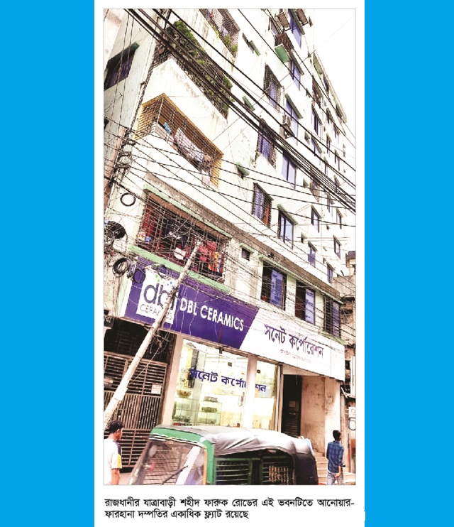 জানা গেছে, ১৬/২ উত্তর-পশ্চিম যাত্রাবাড়ির ওয়াসা রোডে প্রথমে ১টি ফ্ল্যাট কিনলেও পরবর্তীতে ৯ তলা ওই ভবনের প্রায় সবগুলো ফ্ল্যাটই আত্মীয়দের নামে কিনে নেন আনোয়ার-ফারহানা। এছাড়াও উত্তরা ও পূর্বাচলে নামে-বেনামে ৮/৯টি প্লট, নারায়ণগঞ্জে বাড়ি আছে তাদের। প্রতিমাসে শুধুমাত্র গাড়ির পেছনেই ৪০/৫০ হাজার টাকা ব্যয় করেন আনোয়ার-ফারহানা, যা তাদের দু’জনের বেতনের সমতুল্য।
