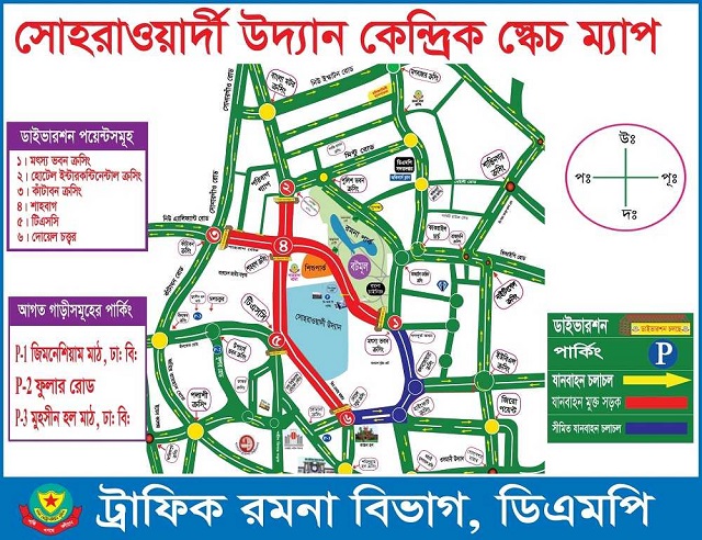 রমনা-ট্রাফিক বিভাগের নির্দেশনায় সমাবেশে আগত গাড়িগুলোকে ঢাকা বিশ্ববিদ্যালয়ের জিমনেশিয়াম মাঠ, মুহসীন হল মাঠ ও ফুলার রোডে পার্কিং করার জন্য বলা হয়েছে।