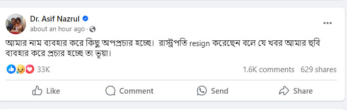 অধ্যাপক আসিফ নজরুল লেখেন, ‘আমার নাম ব্যবহার করে কিছু অপপ্রচার হচ্ছে। রাষ্ট্রপতি রিজাইন (পদত্যাগ) করেছেন বলে যে খবর আমার ছবি ব্যবহার করে প্রচার হচ্ছে- তা ভুয়া।’