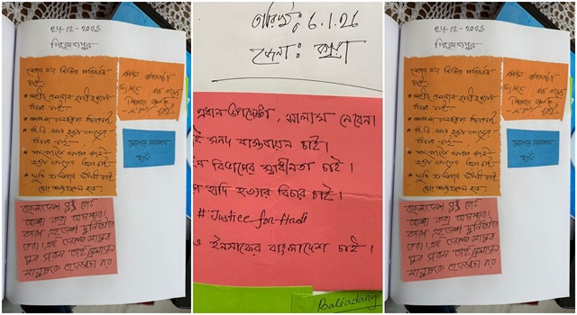 দিনাজপুর থেকে লিজা, বিপাশা, সুমি, লিনা, বৃষ্টি লিখেছেন, ‘জুলাই গণ-অভ্যুত্থানকে মনে রেখে দেশের সুন্দর এবং সুষ্ঠু সংস্কার চাই। নারী ও শিশুদের অধিকার, ধর্ষণের ১০ দিনের মধ্যে রায় কার্যকর হোক। রাজনীতিতে যে দলই আসুক দিনাজপুরসহ দেশের সংস্কারে যেন সবাই নিয়োজিত থাকে।’