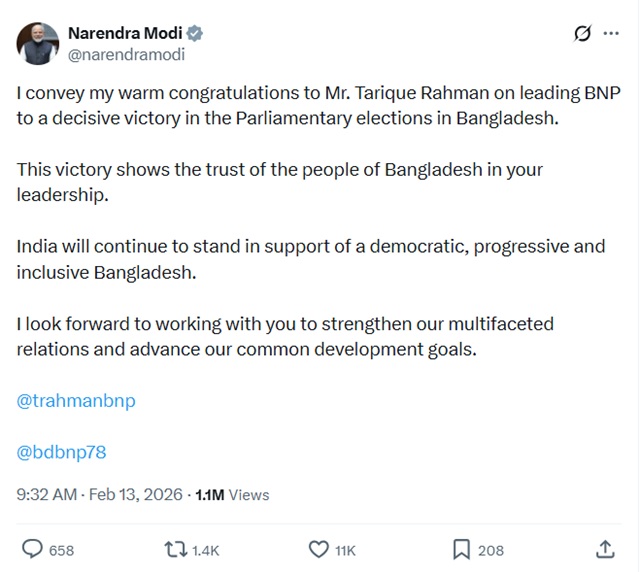 মোদি বলেন, এই বিজয় আপনার (তারেক রহমান) নেতৃত্বের প্রতি বাংলাদেশের জনগণের আস্থার পরিচয় দেয়। ভারত একটি গণতান্ত্রিক, প্রগতিশীল এবং অন্তর্ভুক্তিমূলক বাংলাদেশের সমর্থনের সঙ্গে থাকবে।