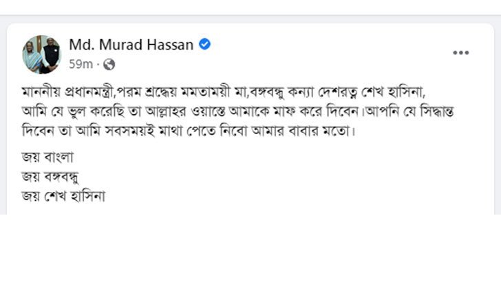 পোস্টে মুরাদ হাসান লেখেন, মাননীয় প্রধানমন্ত্রী, পরম শ্রদ্ধেয় মমতাময়ী মা, বঙ্গবন্ধুকন্যা দেশরত্ন শেখ হাসিনা, আমি যে ভুল করেছি, তার জন্য আল্লাহর ওয়াস্তে আমাকে মাফ করে দেবেন। আপনি যে সিদ্ধান্ত দেবেন, তা আমি সবসময়ই মাথা পেতে নেব আমার বাবার মতো। জয় বাংলা, জয় বঙ্গবন্ধু, জয় শেখ হাসিনা।