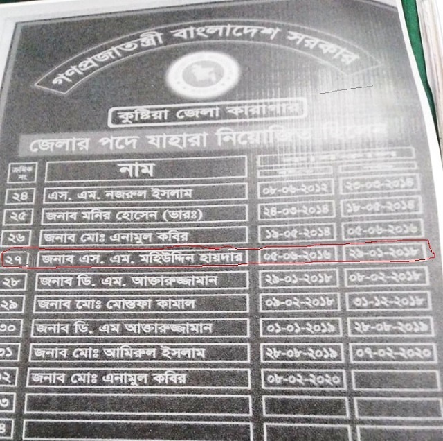 অথচ তদন্তকালিন সময়ে কুষ্টিয়া জেলা কারাগারের সাবেক জেলার এস এম মহিউদ্দিন হায়দার বাগেরহাট জেলা কারাগারে জেলারের দায়িত্বে ছিলেন।