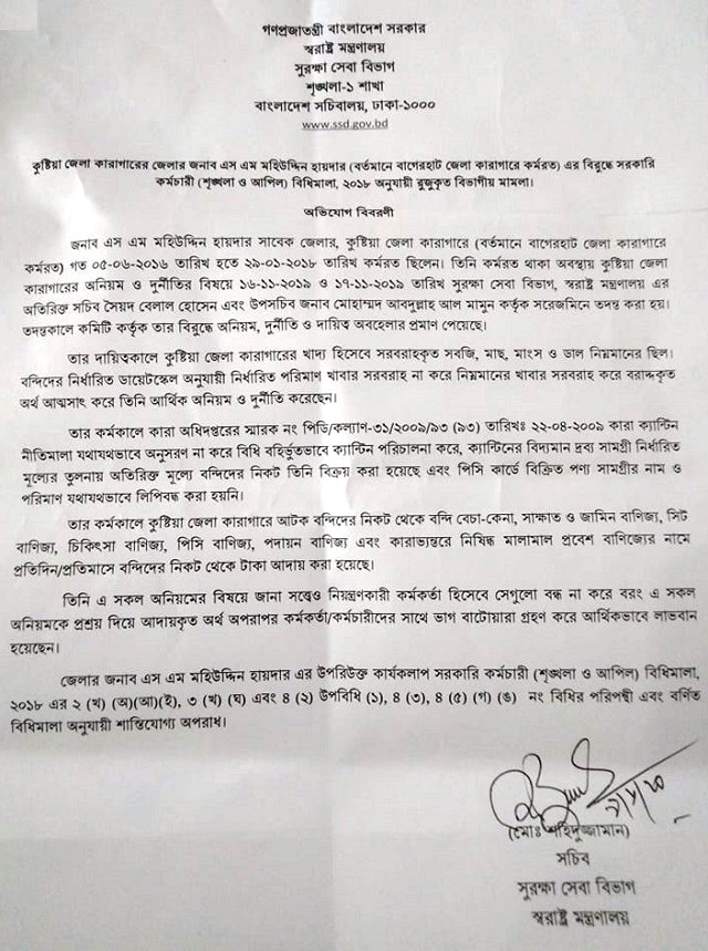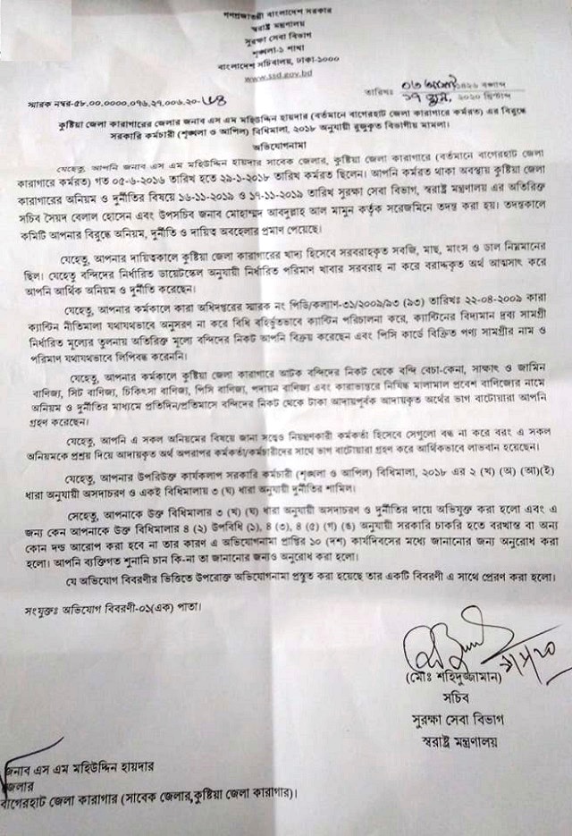 জানা গেছে, ২০১৬ সালের ৫ জুন কুষ্টিয়া জেলা কারাগারের জেলার হিসেবে নিয়োগ পান এস এস মহিউদ্দিন হায়দার। এখানে টানা ২০ মাস দায়িত্ব পালন শেষে ২০১৮ সালের ২৯ জানুয়ারি নতুন কর্মস্থল বাগেরহাট জেলা কারাগারে জেলার হিসেবে যোগ দেন তিনি। সম্প্রতি কুষ্টিয়া জেলা কারাগারের অনিয়ম-দুর্নীতি তদন্ত করতে স্বরাষ্ট্র মন্ত্রনালয়ের সুরক্ষা বিভাগের অতিরিক্ত সচিব সৈয়দ বেলাল হোসেন এবং উপ-সচিব মোহাম্মদ আব্দুল্লাহ আল মামুনকে দিয়ে একটি উচ্চ পর্যায়ের তদন্ত কমিটি গঠন করা হয়। গঠিত কমিটি গত বছরের ১৬ ও ১৭ নভেম্বর সরেজমিন তদন্ত করে কুষ্টিয়া জেলা কারাগারের জেল সুপার মো: জাকের হোসেন, সাবেক জেলার এস এম মহিউদ্দিন হায়দারসহ ৩৪ জন কর্মকর্তা-কর্মচারীর বিরুদ্ধে শাস্তিমূলক ব্যবস্থা নেওয়ার সুপারিশ করে স্বরাষ্ট্র মন্ত্রনালয়ের সুরক্ষা সেবা বিভাগের সচিবের কাছে রিপোর্ট পেশ করে।