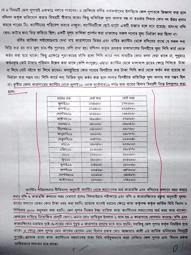 তদন্ত কমিটির প্রতিবেদনে জানা গেছে, ২০১৮ সালের জুলাই থেকে ২০১৯ সালের অক্টোবর মাস পর্যন্ত মোট ১৬ মাসের কুষ্টিয়া কারাগার ক্যান্টিনের আয়-ব্যয়ের হিসাব নেয়া হয়েছে। কারাগারের দেওয়া হিসাব অনুযায়ি এই ১৬ মাসে ক্যান্টিন থেকে আয় হয়েছে ৩৩ লাখ ১ হাজার ৭ শত ৪৩ টাকা। এই সময়ের মধ্যে ক্যান্টিনের পেছনে কারা কর্তৃপক্ষ ব্যয় করেছে ৩৪ লাখ ৯৮ হাজার ১ শত ৬৮ টাকা। অর্থাৎ ক্যান্টিন চালাতে গিয়ে কারা কর্তৃপক্ষ ১ লাখ ৯৬ হাজার টাকা উদ্বৃত্ত খরচ করেছে। ক্যান্টিন পরিচালনা নীতিমালা অনুযায়ি বন্দি ও কারারক্ষি কল্যাণে খরচ দেখানো হলেও বিল ভাউচার পরীক্ষা এবং বন্দি ও কারারক্ষিদের বক্তব্য অনুযায়ি মূলত তাদের কল্যাণে কোনো টাকা খরচ করা হয়নি। জেল সুপার নিজের ইচ্ছামত ক্যান্টিনের লাভ্যাংশ খরচ করেছেন। কারারক্ষি ও বন্দিদের কাছে জেলারের দায়িত্বে নিয়োজিত ডেপুটি জেলার আমিরুল ইসলামের কোনো গুরুত্বই নেই। সবকিছু জেল সুপার নিয়ন্ত্রন করেছেন। প্রত্যেক মাসে কারা ক্যান্টিনের লাভ্যাংশের টাকা বিধি বহির্ভূতভাবে খরচ দেখিয়ে জেল সুপার ও হিসাব রক্ষক কুক্ষিগত করেছেন। এক্ষেত্রে জেল সুপার মো: জাকের হোসেন এবং হিসাব রক্ষক আজহার আলীর আর্থিক অনিয়মের বিষয়টি স্পষ্ট।