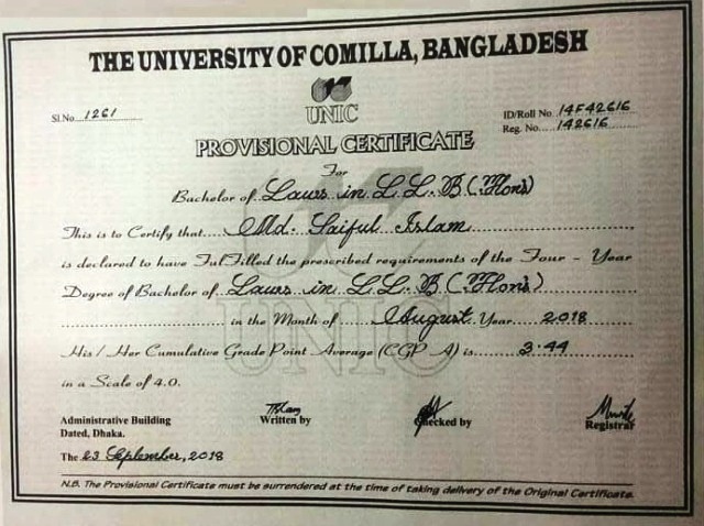 ‘দি ইউনিভার্সিটি অব কুমিল্লা’ নামে রাজধানীর উত্তরা ৮নং সেক্টরের ৯/বি পলওয়েল করনেশন টাওয়ারের ওপরে জায়গা ভাড়া নিয়ে একটি অসাধু চক্র দীর্ঘদিন ধরে মূলত ভূয়া সনদ বাণিজ্যের কারখানা খুলে বসেছে। খোদ প্রতিষ্ঠানটির চেয়ারম্যান অধ্যাপক ডা. আবদুল্লাহ শায়খ মোহাম্মদ বায়েজীদ-উল-হাসান ও তার কয়েকজন অনুসারি (ফিরোজ, এনামুল, বাবু, মেহেদী, তানভীর) মিলে ভূয়া সনদ বিক্রির বিশাল সিন্ডিকেট গড়ে তুলেছে। চক্রটি ব্যাচেলর ও মাষ্টার্স ডিগ্রী, বিবিএ-এমবিএ, ইএমবিএসহ প্রায় অর্ধশতাধিক শর্ট কোর্সেরও সনদ বিক্রি করে কোটি টাকা হাতিয়ে নিয়েছে। আর টাকার বিনিময়ে ভূয়া সনদ কিনে পদে পদে প্রতারিত হচ্ছে অসাধু শিক্ষার্থীরা।