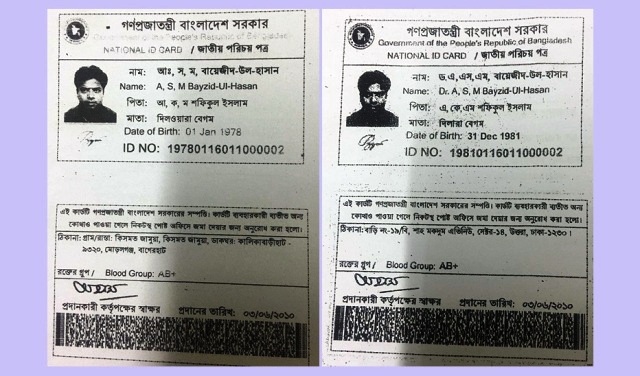 শুধু তা-ই নয়, বায়েজিদ-উল-হাসানের জাতীয় পরিচয়পত্রও ২টি। প্রথমটিতে তার নাম আঃ, স, ম, বায়েজীদ-উল-হাসান, পিতা আ, ক, ম শফিকুল ইসলাম, মাতা- দিলওয়ারা বেগম, জন্ম তারিখ ১ জানুয়ারি ১৯৭৮ইং, গ্রামের বাড়ী মোড়লগঞ্জ, বাগেরহাট। আর দ্বিতীয়টিতে তার নাম ড. এ, এস, এম বায়েজীদ-উল-হাসান, পিতা-এ কে এম শফিকুল ইসলাম, মাতার নাম দিলারা বেগম। এই আইডিতে জন্ম তারিখ কমিয়ে করা হয়েছে ৩১ ডিসেম্বর ১৯৮১ইং। যা আগেরটির চেয়ে ৩ বছরের কম। এখানে ঠিকানা ব্যবহার করা হয়েছে উত্তরা, ঢাকার।