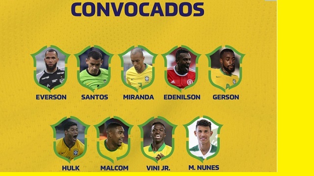ডাক পেয়েছেন গোলকিপার এভেরসন ও সান্তোস, ডিফেন্ডার মিরান্দা, মিডফিল্ডার এদেনিলসন, গারসন ও নুনেস এবং তিন ফরোয়ার্ড হাল্ক, ম্যালকম ও ভিনিসিউস জুনিয়র।