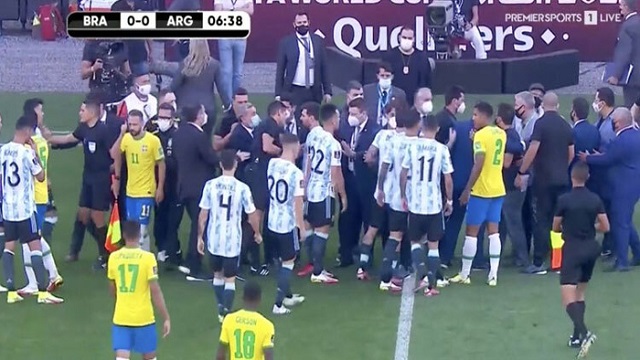 আন্তর্জাতিক গণমাধ্যম বলছে, ব্রাজিল ও আর্জেন্টিনার খেলোয়াড়রা মাঠে প্রবেশ করা স্বাস্থ্য কর্মকর্তাদের ঘিরে ধরলে তারা তখন মেসি ও নেইমারের সঙ্গে কথা বলেন। একপর্যায়ে সমস্যার সমাধান না হওয়ায় রেফারি আর্জেন্টিনার খেলোয়াড়দের ড্রেসিং রুমে পাঠিয়ে দেয়।